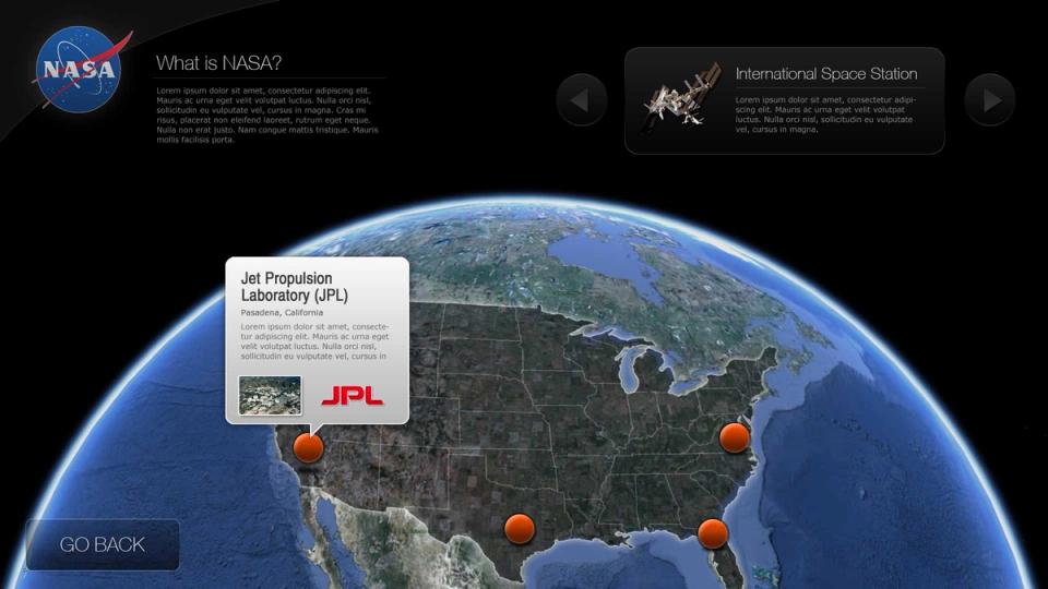 • Learn About NASA: an interactive map with hotspots of locations for key NASA facilities.