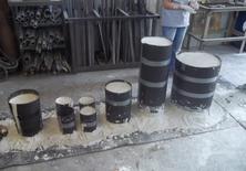 Once all the molds were poured we left them for a little while to cure and set up. As soon as they were ready we removed the wax paper, stacked all the molds up and placed them into the kiln. Over the course of about 48 hours the kiln ran through a carefully programmed heating profile to melt away any wax and burn away any materials and residue leftover. When the cycle finished we were left with perfect, bone-white molds ready for metal casting.
