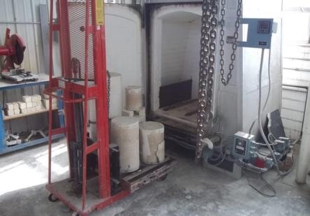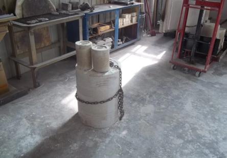 It is vital that the molds don’t have any chance to cool down once the burnout cycle is complete, as that can cause fracturing in the molds and make casting impossible. In preparation for the end of kiln’s heating profile, the professor fired up the crucible furnace and filled the crucible with pieces of aluminum to be liquefied. Once it was near temperature we unloaded the kiln and carefully (but quickly) placed the molds in a pit of sand, covering them up to help preserve the heat during the pouring process.