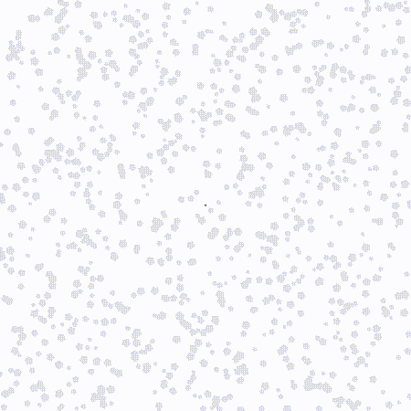 First up, the simplest possible implementation – randomly-placed “seed” particles and a random distribution of uniformly-sized “walker” particles stumbling their way through space: